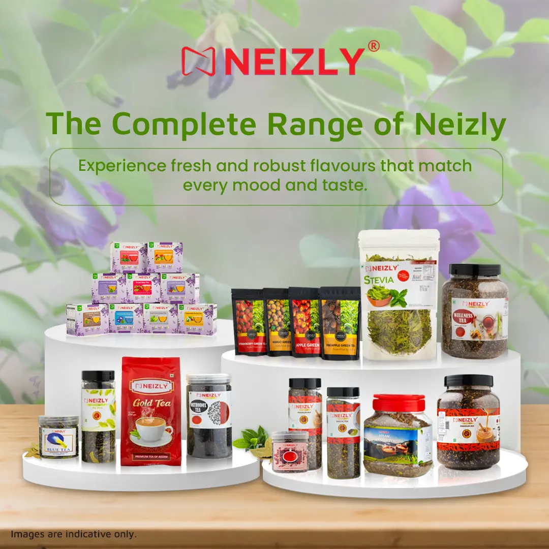Neizly Blue Tea is a caffeine-free herbal blend made from butterfly pea flowers, known for its calming flavour, beautiful blue hue, and natural wellness benefits.